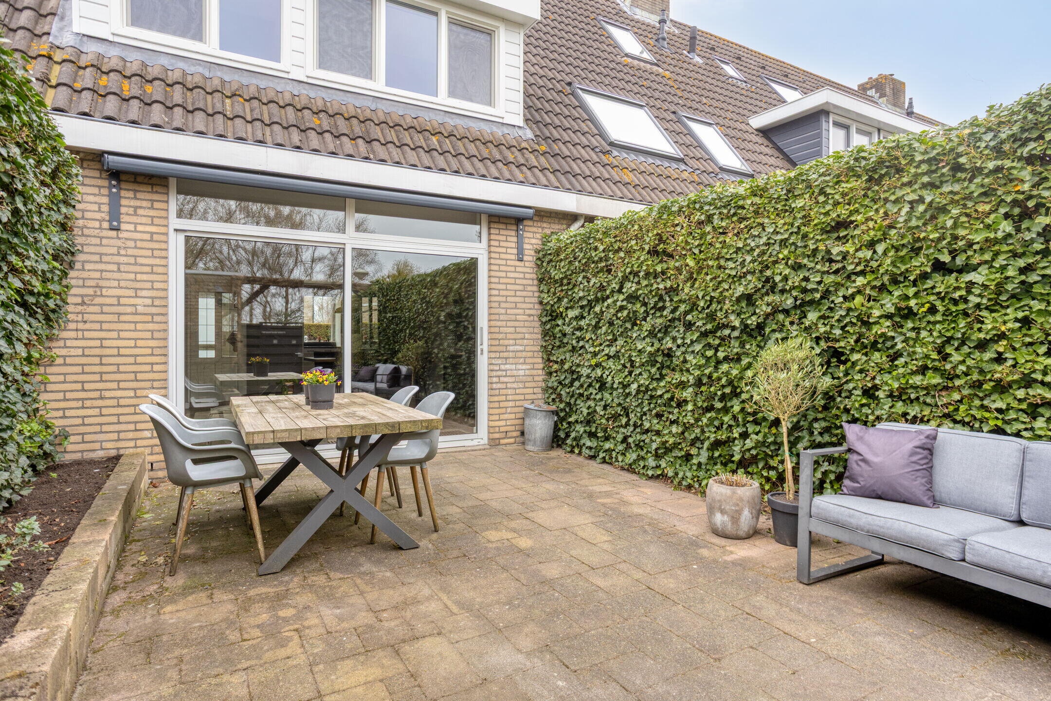 De zonnige achtertuin, die nagenoeg volledig betegeld is, biedt tal van mogelijkheden voor buitenvermaak of gewoon om te ontspannen in de zon. Het terras bij de woning is voorzien van zonwering, waardoor je ook op warme dagen kunt genieten van een schaduwrijke plek. Daarnaast beschikt de tuin over een stenen berging, ideaal voor het opbergen van fietsen en tuingereedschap.