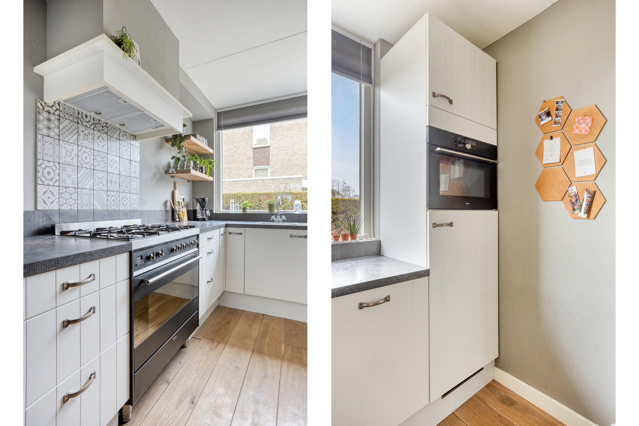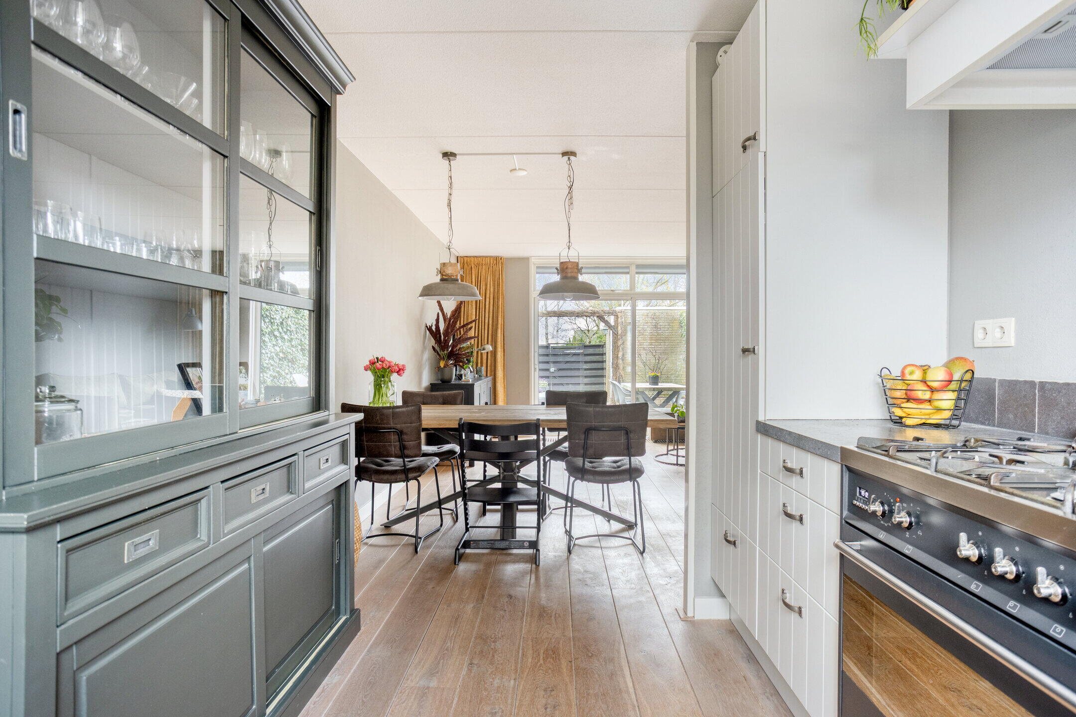 De landelijke open keuken is een ware aanwinst voor de kookliefhebbers! Voorzien van diverse inbouwapparatuur, zoals een kookplaat, afzuigkap, magnetron, oven, koelkast, vriezer en vaatwasser, is deze keuken zowel praktisch als stijlvol. Hier bereid je de lekkerste maaltijden voor je gezin, terwijl je tegelijkertijd geniet van de gezellige sfeer in de woning.